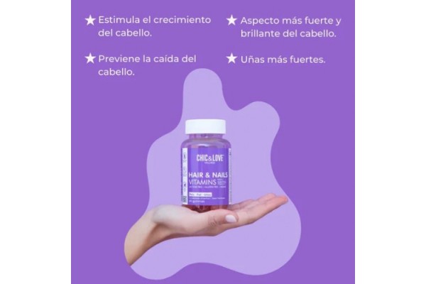 Gominolas sin gluten y sin lactosa aptas para veganos con sabor a frambuesa a base de vitaminas, minerales y activos de alta biodisponibilidad con beneficios directos en el cabello y uñas. Desarrollado por expertos, HAIR&NAILS es una fórmula única con activos que contribuyen a engrosar, a mejorar el anclaje, así como frenar la caída provocada por cambios de estación, hormonales y situaciones fisiológicas que alteran nuestra salud capilar, aumentando la densidad del grosor del cabello.