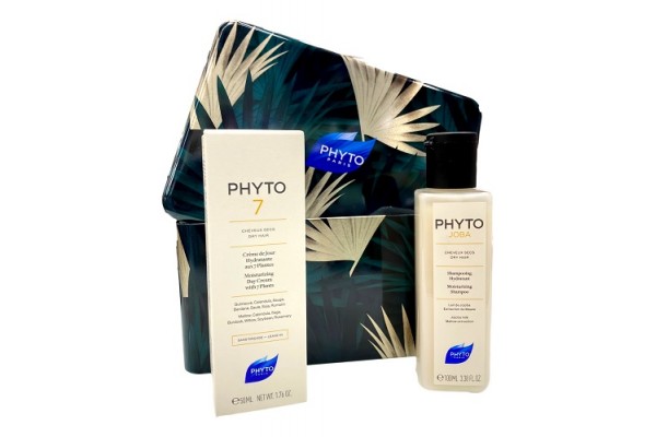 La caja de navidad de Phyto es una caja metálica con Phyto 7 crema de día capilar para cabellos secos de 50 ml y de regalo un Phytojoba champú para cabellos secos de 100 ml.