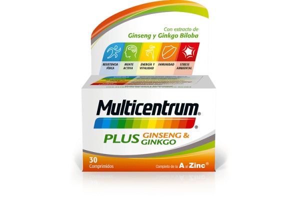 Multicentrum Plus Ginseng & Ginkgo es un multivitamínico formulado con 13 vitaminas, reforzado en vitaminas del grupo B, y con 8 minerales. Además, contiene extractos de Ginkgo Biloba y Ginseng. El Panax Ginseng, conocido como adaptógeno, ayuda al rendimiento mental y físico y mejora la resistencia al estrés y al cansancio. El Ginkgo Biloba es conocido por ayudar al normal funcionamiento de la microcirculación cerebral, ayudando a mantener la memoria y las funciones cognitivas en periodos de esfuerzos mentales intensos.