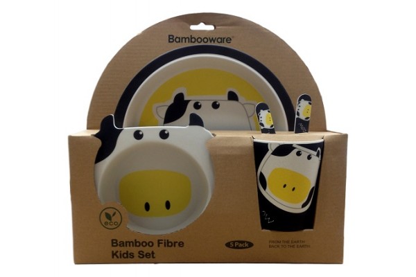 Vajilla de bambú infantil. 5 pack: 1 plato, 1 plato hondo, 1 vaso, 1 cuchara y 1 tenedor